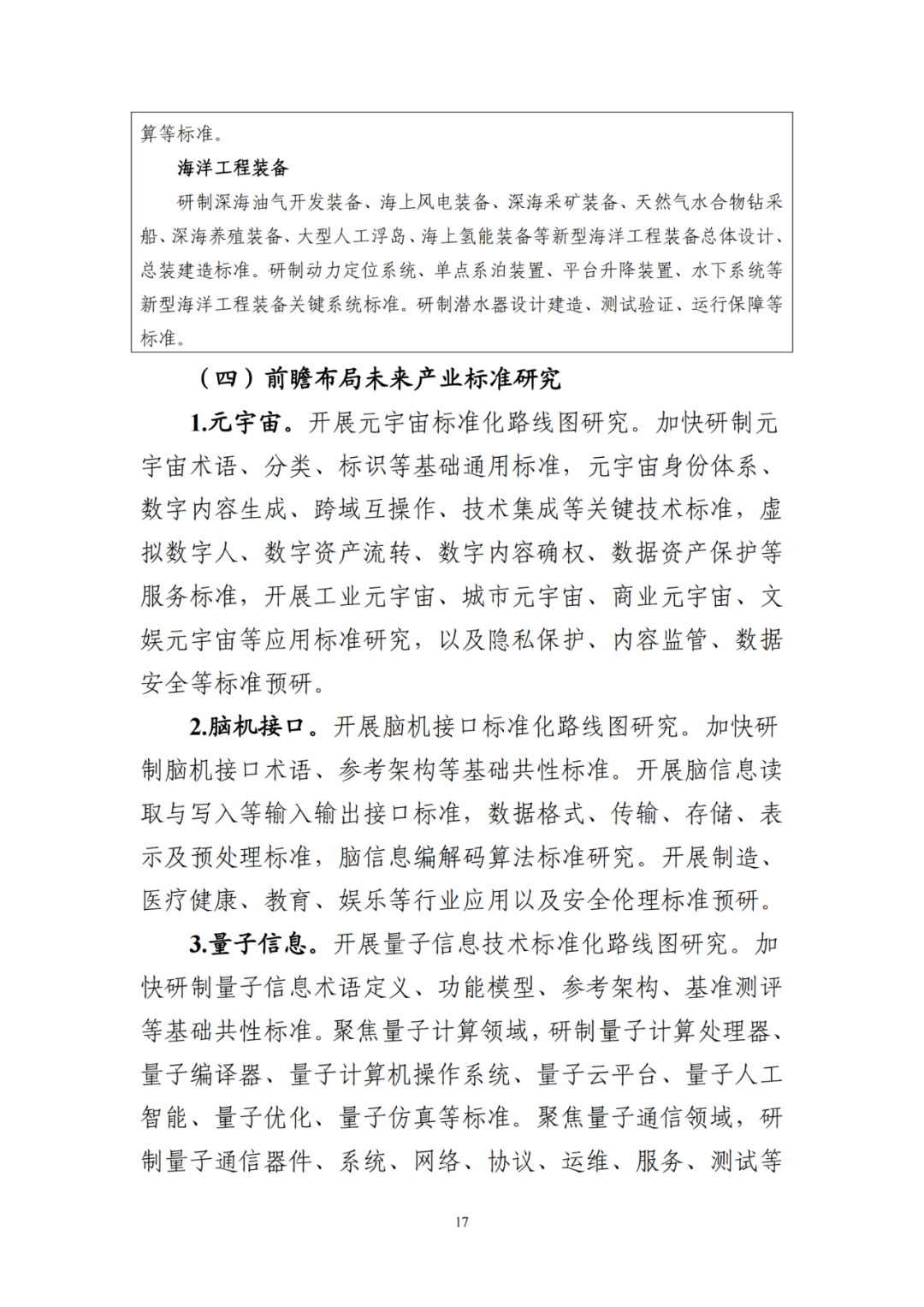 为贯彻落实《国家标准化发展纲要》,持续完善新兴产业标准体系建设,前瞻布局未来产业标准研究,充分发挥标准的行业指导作用,引领新产业高质量发展,工业和信息化部、科技部、国家能源局、国家标准化管理委员会组织编制了《新产业标准化领航工程实施方案(2023─2035年)》。现印发你们,请结合本地区、本行业实际,抓好贯彻落实。