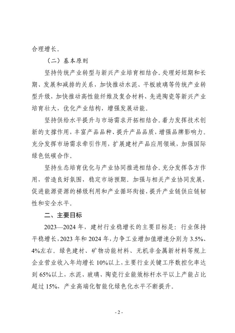 其中提出,2023—2024年,建材行业稳增长的主要目标是:行业保持平稳增长,2023年和2024年,力争工业增加值增速分别为3.5%、4%左右。绿色建材、矿物功能材料、无机非金属新材料等规上企业营业收入年均增长10%以上,主要行业关键工序数控化率达到65%以上,水泥、玻璃、陶瓷行业能效标杆水平以上产能占比超过15%,产业高端化智能化绿色化水平不断提升。