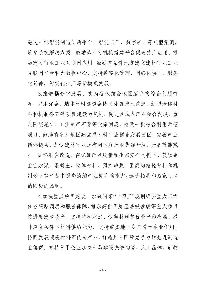 通知指出:加强产融合作,鼓励金融机构为绿色低碳技术改造、新产品推广应用、绿色建材下乡活动等提供综合性的金融服务。加快产能置换政策修订,突出市场化调节作用。推动企业绿能核减政策实施,研究推动水泥行业纳入全国碳排放权交易市场。完善绿色电价政策,增强政策协同效应。支持社会资本以市场化方式设立建材行业绿色低碳转型基金,鼓励建材企业绿色转型和创新发展。