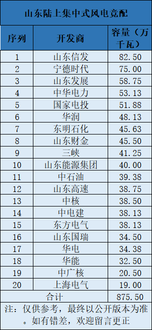 山东8.8GW集中式陆上风电项目竞配结果:中核、中石油、国电投、宁德时代等上榜
