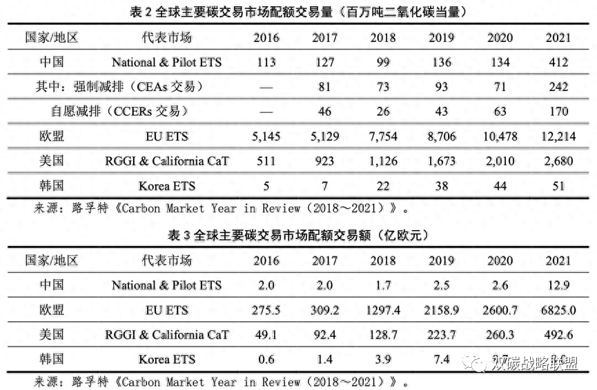 由于配额总量的确定涉及到政府行为,市场参与者的自主性不高,因此本文主要研究配额交易的二级市场1,且考虑到发展中国家的碳交易市场发展水平普遍较低,本文主要以欧洲、 美国、韩国等发达国家和地区的市场作为比较对象。(注:与资本市场类似,碳交易市场也分为一级市场和二级市场,一级市场是排放配额、减排项目等的发行和审核市场,市场规模与政策关联度较高;二级市场则是与之相关的现货资产和衍生品资产流通的市场,为碳交易市场提供流动性。)