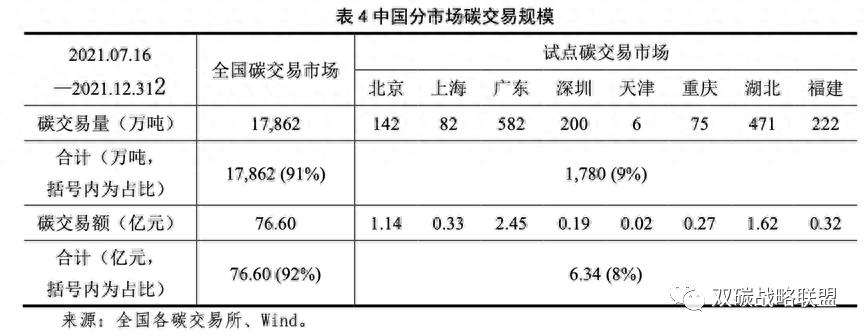 在区域分布方面,通过整理各交易所披露的交易数据(表4), 不难看出自全国碳交易市场启动以来,全国市场的交易规模占据国内市场的 90%以上,而以广东为首的市场则占据试点市场交易的主要部分,因此从试点市场切换至全国市场缓解了国内不均衡的碳交易状况,有利于形成区域间协同发展的更为均衡的市场结构。