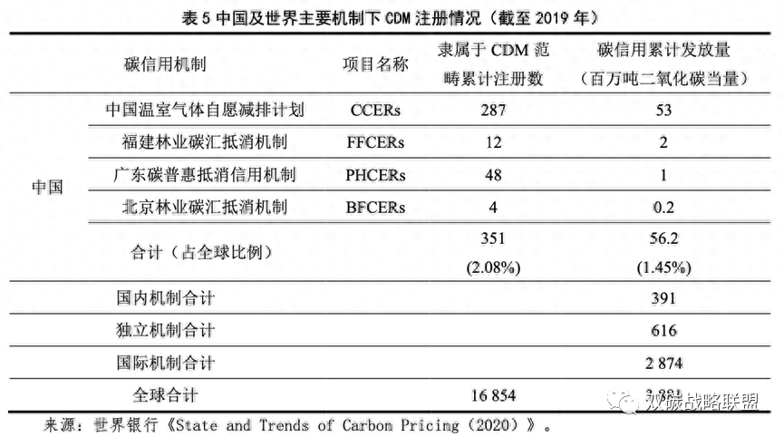 2017 年,为对 CCER 体系进行优化,国家叫停了项目备案过程,市场仅可对存量 CCER 进行交易。截至2021年4月,根据发改委披露的数据,中国目前共有2 871个CCER 审定项目、861 个备案项目以及254个减排量备案项目。然而根据世界银行披露的数据(表5),这其中被国际上认可的属于 CDM 范畴的独立项目并不多,截至2019年只有 287 个累计注册项目,加上区域试点的部分仍只占全球数量的 2%,对应碳信用的排放 量不足1亿吨,在国际市场的比重更低。可以看到,由于减排项目的审核存在不确定性,监管机制尚不完善,国际和国内的自愿减排体系都面临监管难题,从而出现市场供需错位和增长速度放缓的问题,并且由于中国自主建设该项目的时间较晚,相对而言更不成熟。