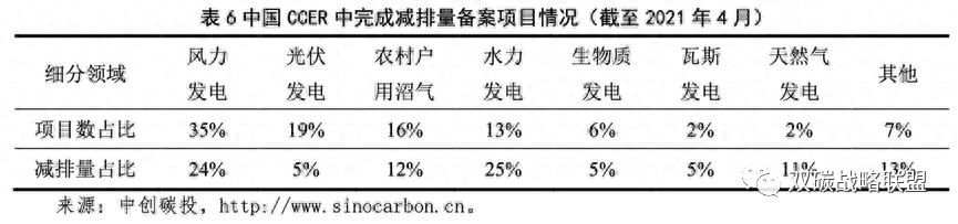 在行业分布方面,完成减排量备案的 254 个 CCER 的减排量可在碳交易市场上进行买卖,作为配额交易的补充机制帮助企业完成清缴,其中,根据中创碳投的数据(表6),从细分行业的视角来看风力发电和水力发电项目覆盖的碳排量占比近50%, 是国内发展较为成熟的清洁能源领域,也是CCER体系的重要组成部分。