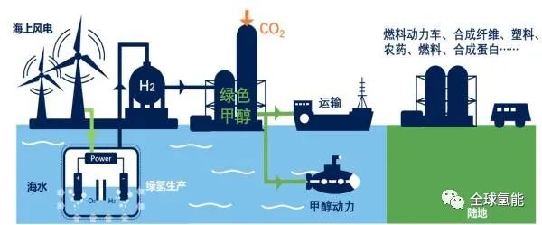 再次,未来也可打造“海水制氢+绿色甲醇一体化”技术产业链,即直接使用海水制氢,并通过空气捕获二氧化碳,就地转化为甲醇燃料,通过海上现有的油气管道或甲醇动力船舶或甲醇运输船完成绿色甲醇的运输/消纳,实现对海上可再生能源驱动的负碳“氢→绿色甲醇”转化,为燃料动力车、合成纤维、塑料、农药、燃料、合成蛋白等提供重要载体。