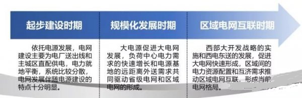 中国电网经历了起步建设、规模化发展和区域电网互联形成三个时期(如下图1),电网功能由简单的电力外送,发展到城市间、省间乃至跨大区域间的电力资源优化配置。在此过程中,大电源和西电东送的发展共同促进了大电网的发展,但当系统达到一定规模之后,大电网的边际效应将逐步递减。未来电网的建设主角将由输电网逐渐演变为配电网。