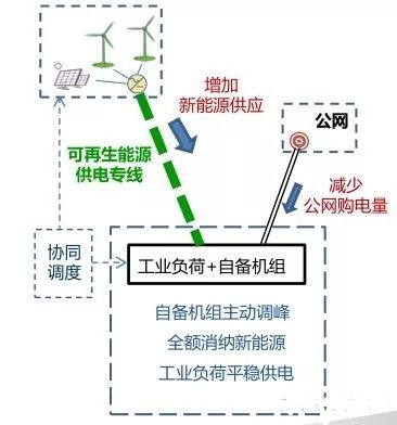建设至工业园区的新能源输电专线,直接增加大工业用户的可再生能源电力供应,利用自备电厂调峰全额消纳新能源。