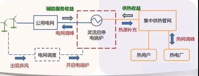 建设电锅炉接入城区一次供热管网,作为热电机组的补充热源,与工业余热综合利用相结合,实现电热联合调峰。电锅炉参与调峰辅助服务市场交易,获得辅助服务补偿费用。同时,鼓励供热电量参与电力交易,按弃风电量交易价格结算。