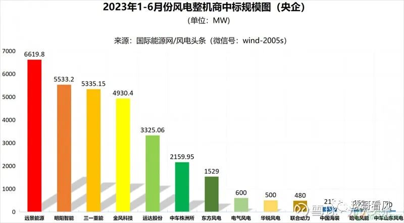 金风科技,远景能源,运达股份,三一重能和明阳智能稳居前五,第六名与第五名的差距继续保持,前者基本为后者的50%不到。