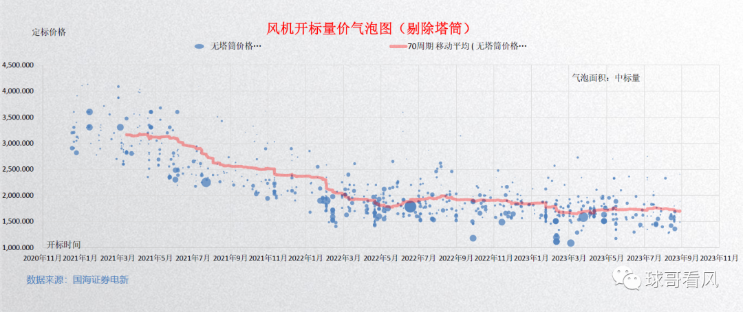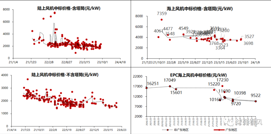 竞争格局集中的同时,我们也欣喜的看到了风电整机装备行业开始冷静和严谨。财通证券统计结果显示,无论是海陆,风电整机2023年下半年的中标价格已经开始恢复性的回弹,从下图我们也可以清晰的看到。