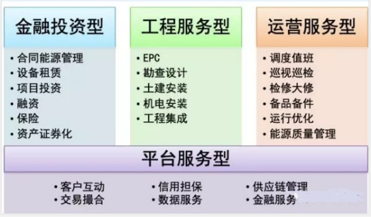 这类综合能源公司侧重于提供金融和投资相关服务,比如从事项目投资(合同能源管理本质上是一种投资型项目)、设备租赁(或者金融租赁)、融资、工程或者设备保险、资产证券化等业务。
