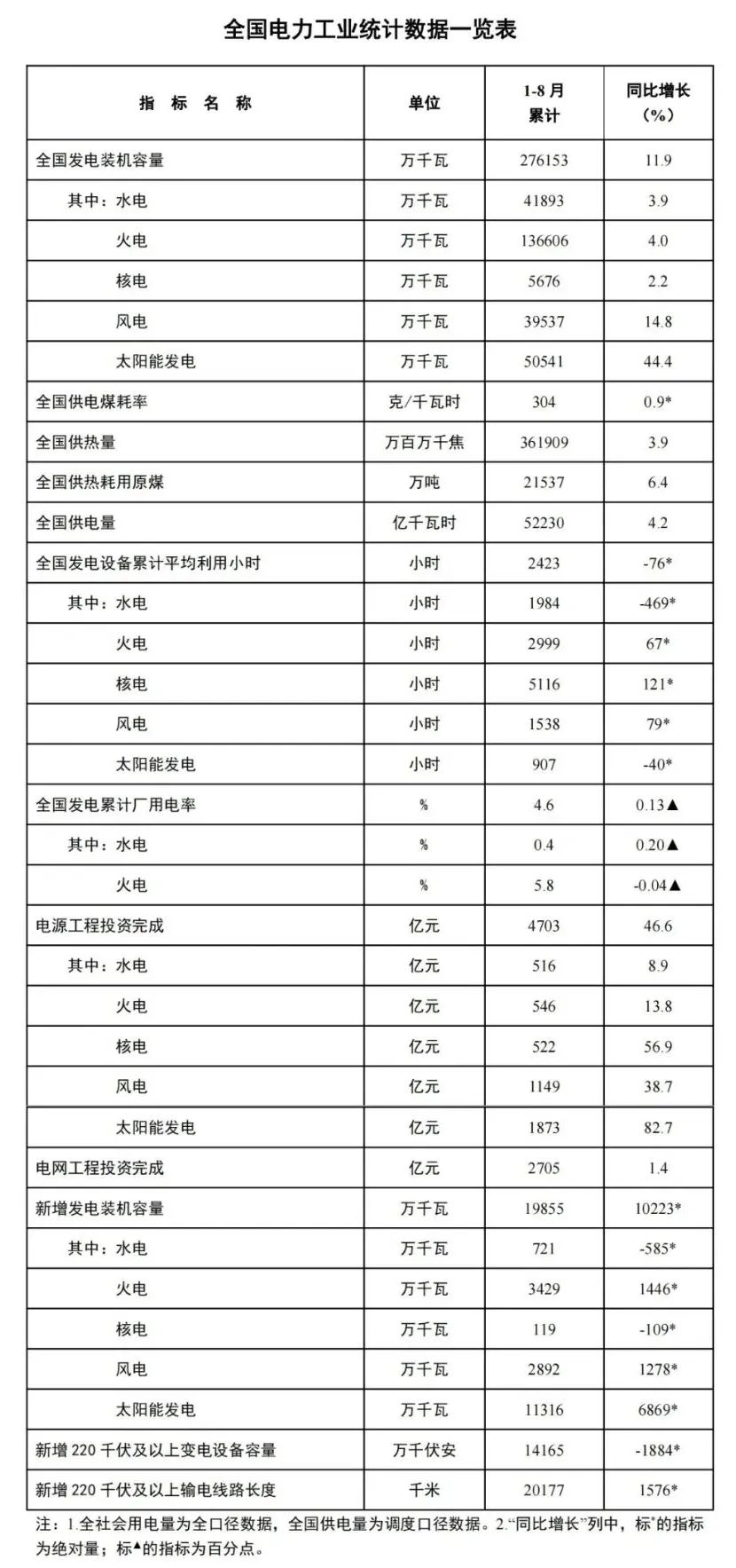 日前,国家能源局发布1-8月份全国电力工业统计数据。