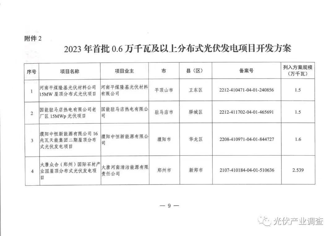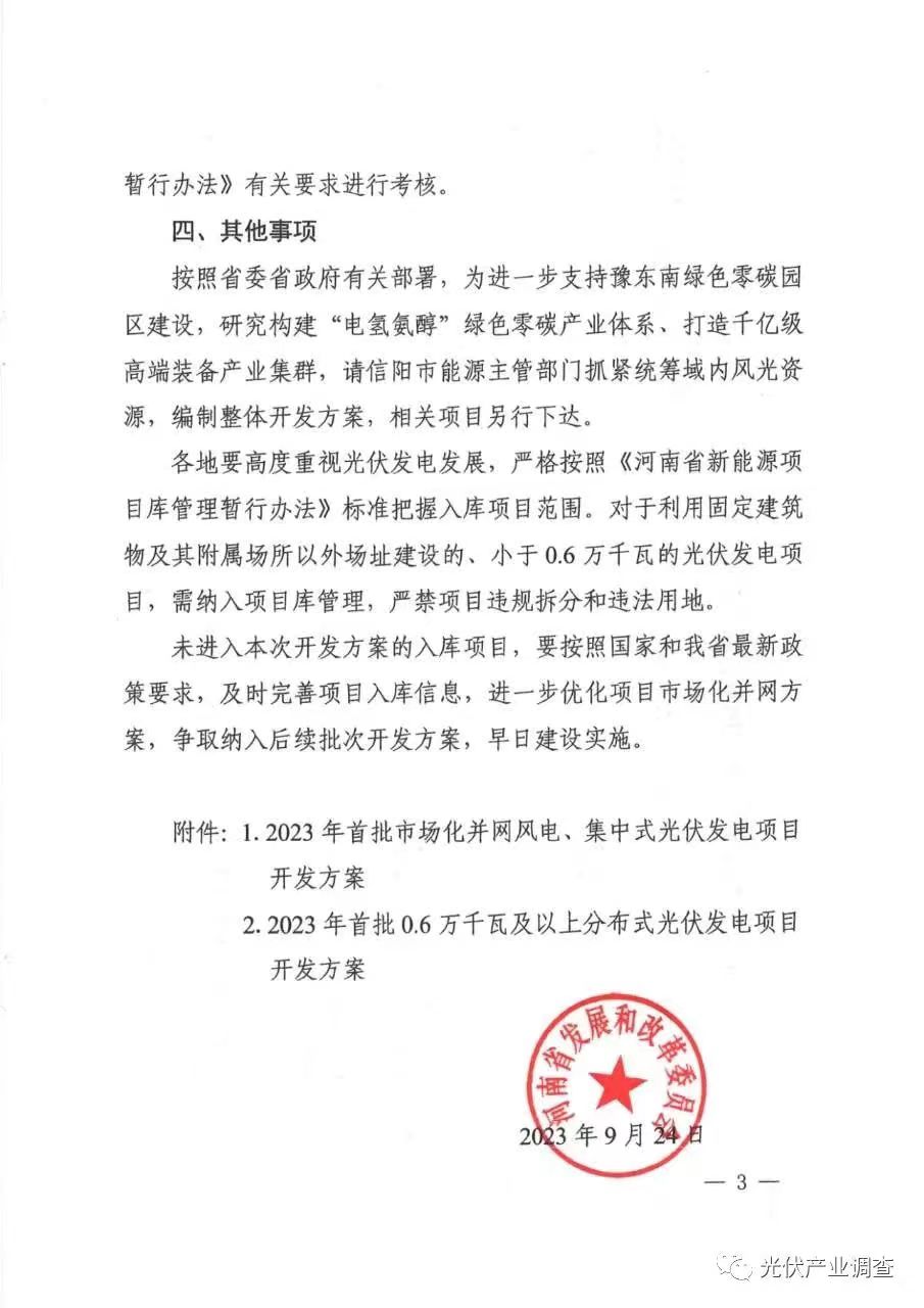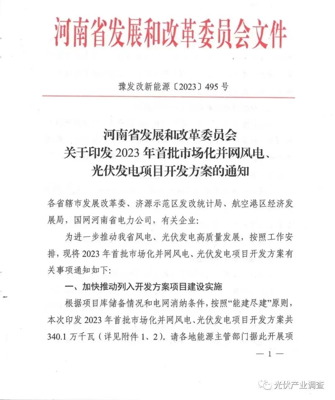 9月25日,河南省发改委印发《2023年首批市场化并网风电、光伏发电项目开发方案的通知》。《通知》指出,本次印发项目共计340.1万千瓦,其中风电共计310万千瓦、光伏共计23万千瓦、分布式光伏共计7.14万千瓦。