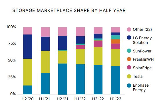 美国从2020年上半年到2023年上半年储能厂商的市场份额