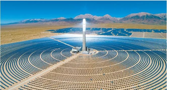 当数万面定日镜随着太阳运行的轨迹追踪热量,将太阳的热能汇聚到吸热塔中,由热能到电能就这样完成了不可思议的转换……