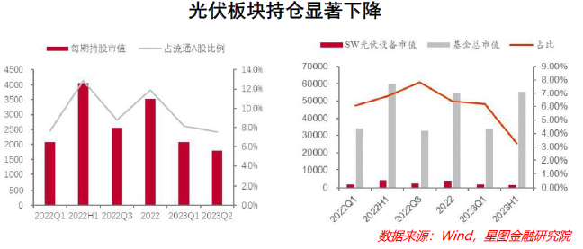 另一方面,从机构对光伏的持仓来看,持仓环比显著下降。截至2023年上半年,SW光伏设备板块基金持股在总流通A股的比例为7.5%;在所有基金持仓中,SW光伏设备的占比为3.2%,环比2023年Q1下降2.9pct,继续下降的空间有限,具有较强的安全边际。