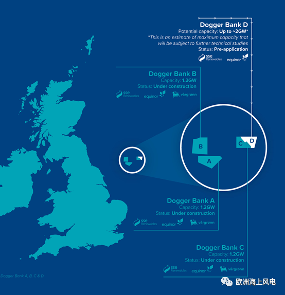 Dogger Bank海上风电场位于英国北海,由Equinor、SSE和Vargronn共同开发,装机容量3.6GW,分3个场址,每个1.2GW,平均离岸130km。其中,Dogger Bank A和B都将安装95台GE Haliade-X 13MW风机,Dogger Bank C则将安装87台GE Haliade-X 14MW风机。