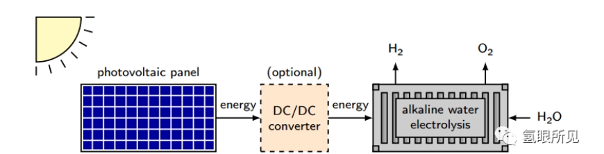 图1:太阳能电解碱性水示意图。光伏板将太阳辐射转化为电能,可用于运行。DC/DC功率转换器是可选的,因为直接和间接耦合是可能的