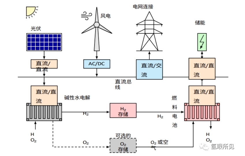 光伏和风机产生的可再生能源可为碱性水电解槽提供动力,而储存的氢可通过燃料电池重新转化为电能。因此,氧气或空气均可利用(部分氧气可以补入燃料电池提高反应效率)。额外的储能装置可以抑制和管理波动,整个氢能源系统可用于稳定电网。