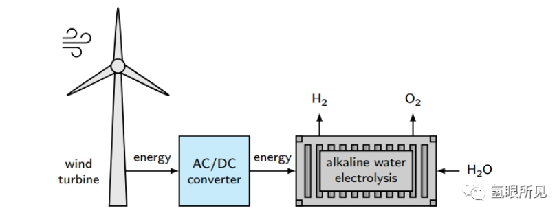 图2:风能驱动碱性电解水示意图。风机将可用的风力转化为电力,用于运行。一个合适的AC/DC转换器的实现是必须的