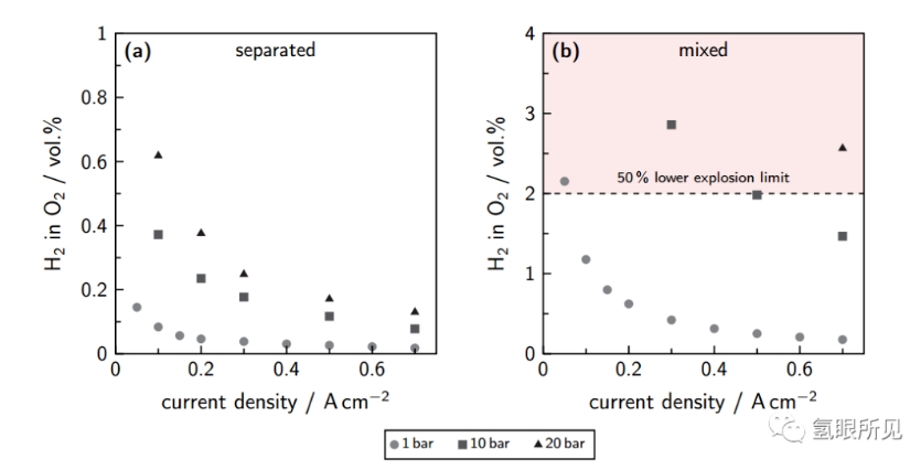 图4:(a)分离电解质和(b)混合电解质循环,温度为60℃,电解质浓度约为32 wt.%,电解质体积流量为0.35 L/min 时,阳极气体杂质(氧中氢)与不同压力水平下电流密度的关系。