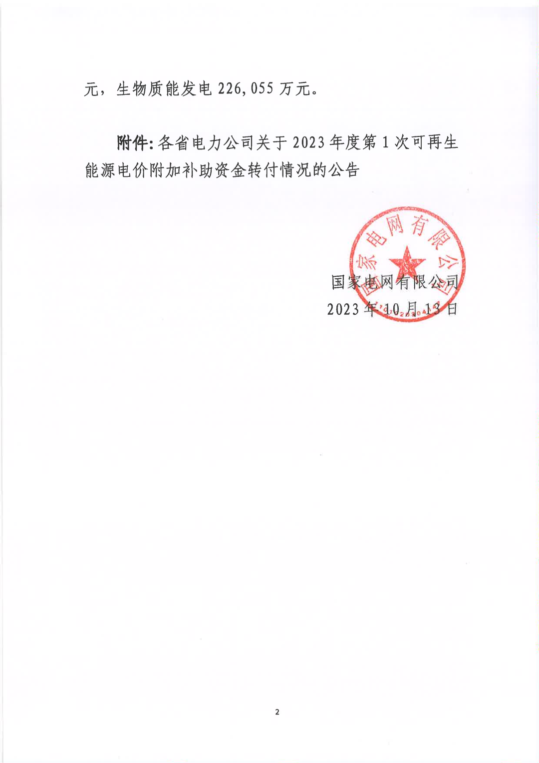 10月19日,国网新能源云发布《关于2023年度第1次可再生能源电价附加补助资金转付情况的公告》,截至9月末,财政部下达2023国家电网公司可再生能源电价附加补助资金年度预算500亿元,已转付各省级电力公司。
