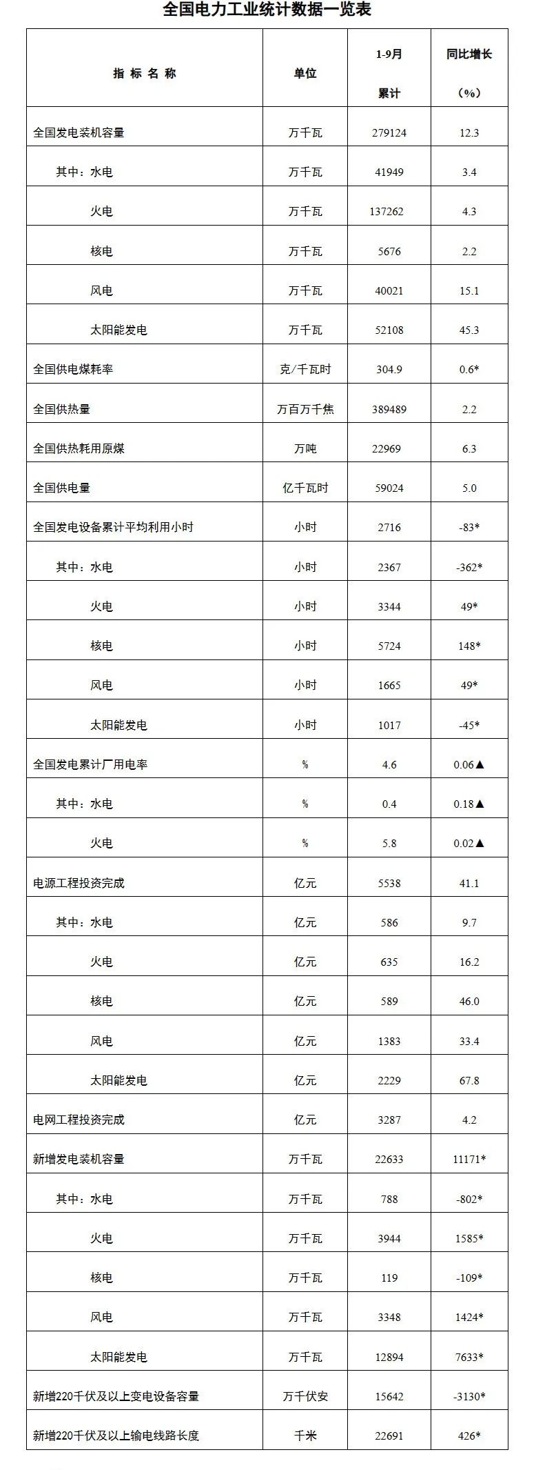 10月23日,国家能源局发布1-9月份全国电力工业统计数据。