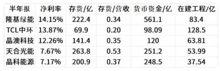 我们看一下半年报除开硅料环节占比大的通威,主要光伏龙头企业的净利率排行如下: