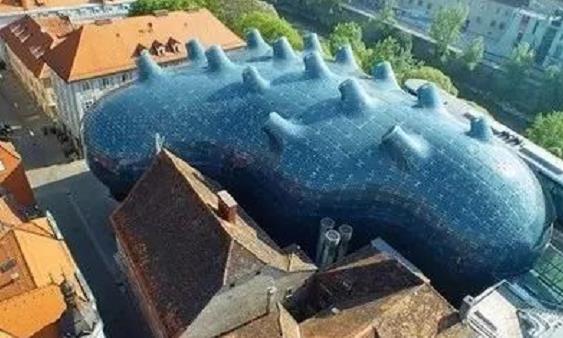 拉茨美术馆表面覆盖了数千块半透明的丙烯酸玻璃板,形成了一个“大像素表面”,宛如外星人怪物!外表面的集成光伏组件能用来发电,同时屏幕表层安装了计算机控制的光源,可以进行大屏幕播放,与周围环境相得益彰。