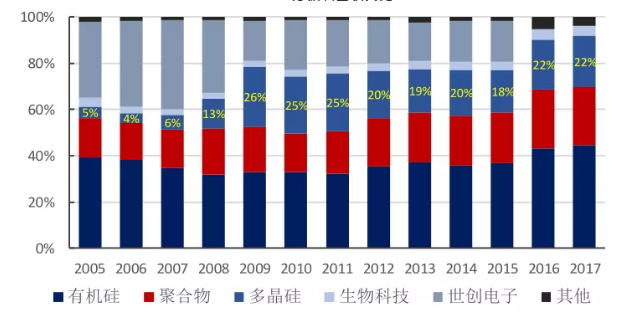 瓦克是一家全球运营的化工集团,共有员工约14,500人,年销售额约达49.8亿欧元(2018年)。当前业务板块包括有机硅、聚合物、多晶硅和生物科技等,并在有机硅、多晶硅及聚合物板块中的乳胶粉和VAE共聚乳液等领域占据全球龙头地位。近年来多晶硅板块占公司整体营收的比重在20%左右。