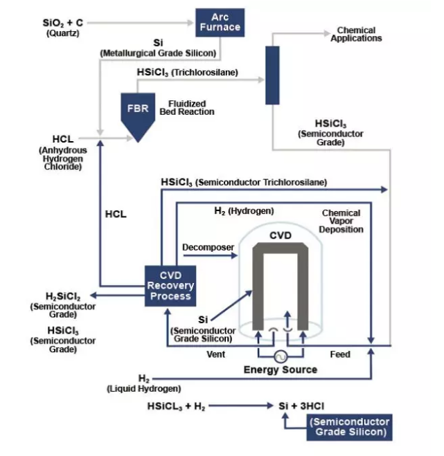 Hemlock Semiconductor(HSC)是一家致力于为电子和太阳能行业提供高纯度多晶硅的可靠供应商。Hemlock的工艺从天然高纯度石英岩开始,它被加工成硅基化学品三氯氢硅。使用化学气相沉积反应器技术工艺,将三氯氢硅转化为纯度高达99.999999999%的高纯度多晶硅。