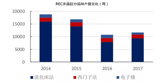 REC于1996年12月在挪威成立,专注于高纯硅材料领域,业务包括太阳能级多晶硅、电子级多晶硅和硅烷气体等。REC是硅烷流化床生产工艺的代表,其每年多晶硅产量中,约80%为流化床工艺生产,10%为西门子法生产,还有部分电子级多晶硅产品。REC两大生产基地均位于美国,摩西湖(Moses Lake)基地主要生产太阳能级多晶硅,比尤特(Butte,Montana)基地主要生产电子级多晶硅和硅烷气。多晶硅是REC最主要业务,2012年占总营收的80%以上,近年来受中美多晶硅贸易政策影响,摩西湖基地产能利用率仅在50%左右,销量下滑导致营收占比下降,其整体业绩也呈下滑趋势。
