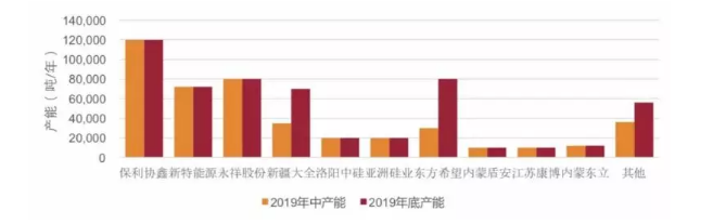 截止到2019年6月底,国内多晶硅企业名义产能超过万吨级别的有保利协鑫12万吨,新特能源7.2万吨,永祥股份8万吨,新疆大全3.5万吨,洛阳中硅2万吨,亚洲硅业2万吨,东方希望3万吨,内蒙盾安1万吨,江苏康博1万吨,内蒙东立1.2万吨,十家产能共计40.9万吨/年,约占国内总产能的94.5%,头部企业的市占率在稳步提升。预期到2019年年底,国内多晶硅产能将达到将达到53.8万吨/年,主要增量来自下半年大全新能源3.5万吨产能,东方希望5万吨产能,天宏瑞科1万吨产能,其他产能1万吨的扩产。