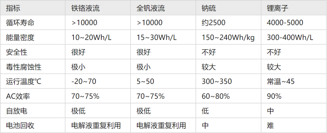 图说:液流电池(铁铬、全钒)与其他电化学电池技术对比