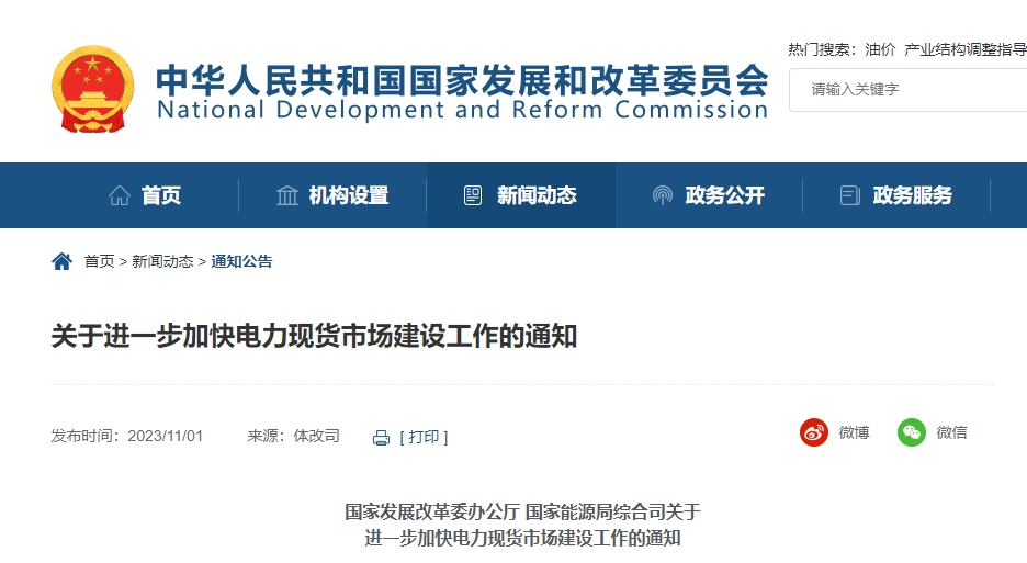 11月1日,国家发改委、能源局综合司正式发布《关于进一步加快电力现货市场建设工作的通知》(以下简称《通知》)。
