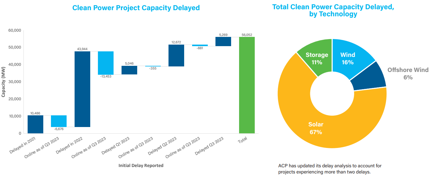 越来越多的项目延迟,导致清洁电力安装低于2023年的预期。截至2023年第三季度,开发商报告了近23GW的项目延迟。考虑到2021年和2022年的延迟,清洁能源项目的总体延迟累计已超过56GW。