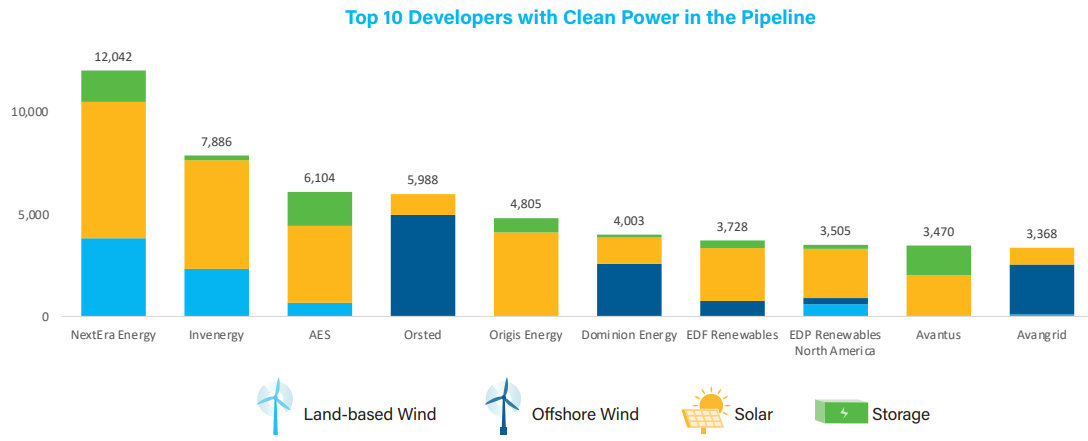 NextEra是美国的陆风、光伏和电化学储能的领导者,以12GW的项目储备位列第一,市场占比为8%。Invenergy以7.9GW位列第二。排名前十的项目开发商中,有七家公司的项目储备主要集中在光伏。