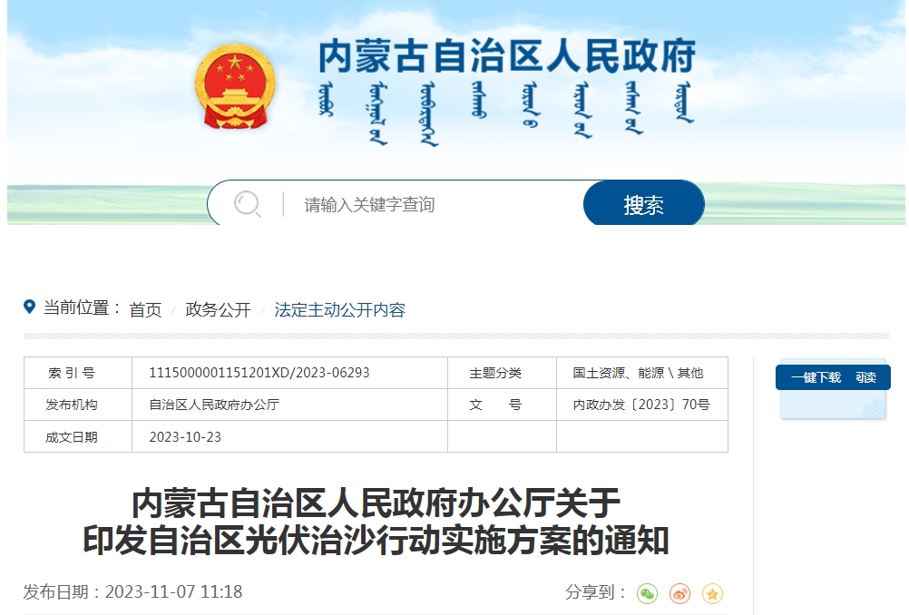 11月7日,内蒙古印发《光伏治沙行动实施方案的通知》。《通知》提出:为配合“三北”六期等生态治理工程,实施全区沙漠、沙地光伏治沙规模化开发,初步规划到2025年,光伏治沙装机规模超2140万千瓦,完成光伏治沙面积64万亩;到2030年,光伏治沙装机规模8900万千瓦,完成光伏治沙面积约230万亩。