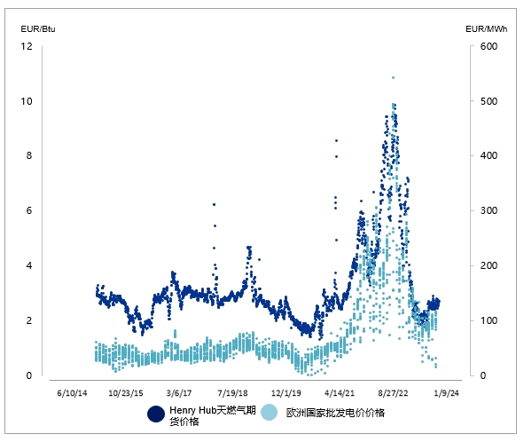欧洲国家平均的批发电价价格受天然气影响在2022年同比上涨超400%。