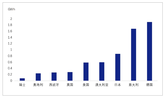 2022年年初,欧洲因俄乌冲突对俄罗斯天然气的制裁短期内推高了电价,也造成了多地区的能源短缺与停电现象。居民在面对高电价与电力供应不稳定的情况下纷纷选择光储设备。据EESA统计,2022年排名前9的市场中,2/3的国家来自欧洲,其中德国(新增1.9GWh)与意大利(新增1.7GWh)不仅排名第一与第二,同时占比整个欧洲市场容量的70%。