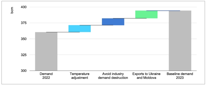 一篇来自IEA的报告《欧洲如何在2023避免天然气短缺》中提出2023年的天然气需求相比2022年约3600亿立方米的天然气需求提升至3950亿立方米。需求的增加主要来自气候调节、工业不限制产能、对乌克兰摩尔多瓦的天然气支持。