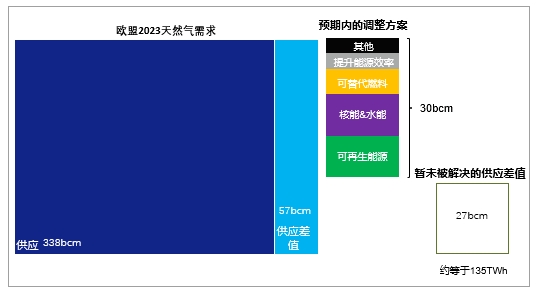 3个因素相加的情况下将为欧盟带来约570亿立方米的天然气需求空缺,而欧盟一系列已存在的措施有望解决300亿立方米天然气的需求难题,但其中约270亿立方米的需求空缺则无法被当前已有的方案与措施解决。综上,就当前的情况,欧洲仍然具备出现类似天然气供给不确定性而引起天然气价格失控的可能。