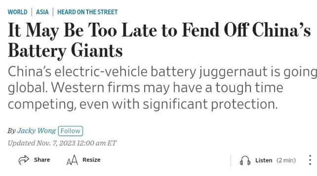 前几天,《华尔街日报》的一篇文章指出,中国的电动汽车电池巨头正走向世界,而西方企业想要阻挡恐怕为时已晚,即便采取各种重要的保护措施,也可能会在竞争中遇到困难,甚至败下阵来。