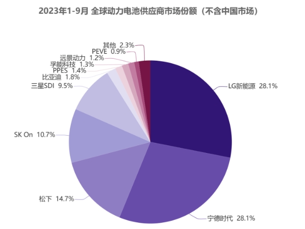 在除中国以外的全球电池市场,宁德时代也与LG新能源以28.1%的市场份额并列第一。