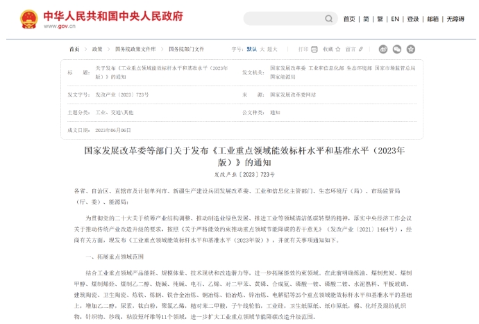 2023年6月,国家发改委、工信部、生态环境部、市场监管总局和国家能源局联合印发的《工业重点领域能效标杆水平和基准水平(2023年版)》中提出了进一步强化升级节能降碳目标。