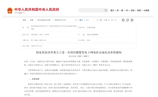 2021年10月,国家发改委发布了《关于进一步深化燃煤发电上网电价市场化改革的通知》,明确高耗能企业燃煤发电市场交易价格不再受上浮20%的限制。
