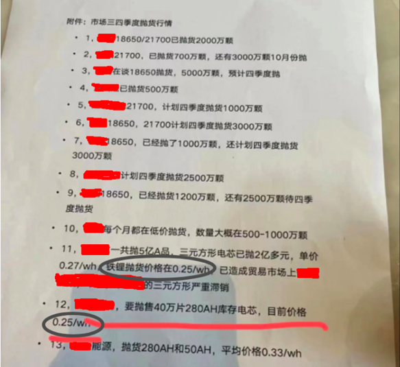最近一张未经证实的“电芯市场三四季度低价抛货”的照片在业内引起轩然大波。照片显示,各大电芯厂商正在进行大规模低价抛货,电芯价格已低至0.25元/Wh。