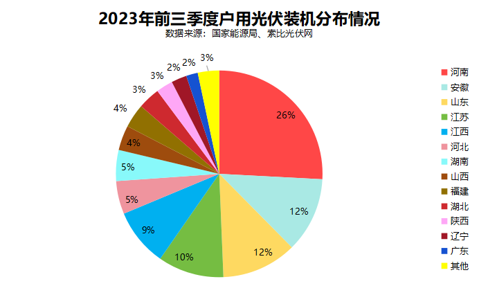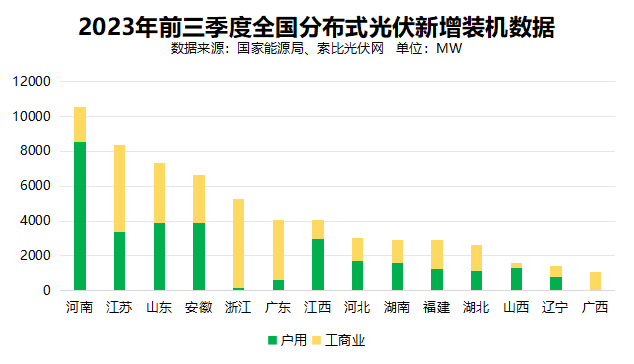 光伏发电方面,2023年前三季度,光伏新增装机12894万千瓦(128.94GW),同比增长145%,其中集中式光伏6180万千瓦(61.8GW),分布式光伏6714万千瓦(67.14GW),分布式光伏占比超过52%。分地区看,河南、山东、江苏、湖北等11个省(自治区),前三季度光伏发电新增装机超过5GW,其中7省的分布式光伏占比都超过一半。最高的河南省,分布式光伏占比超过98.6%,成为名副其实的“分布式光伏发展热土”。