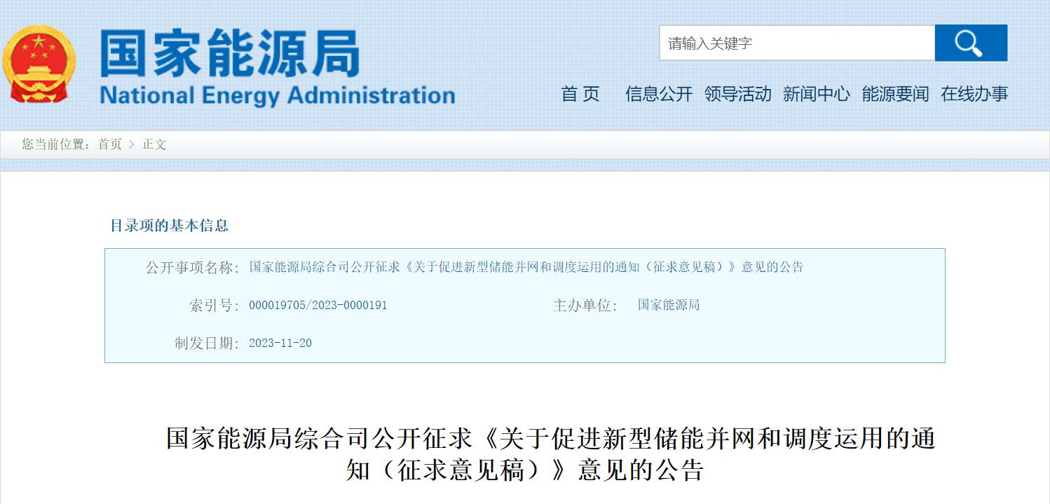 11月20日,国家能源局综合司发布公开征求《关于促进新型储能并网和调度运用的通知(征求意见稿)》意见的公告。