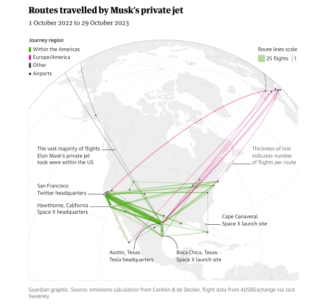 马萨诸塞大学可持续发展科学家Jared Star的研究发现,美国最富有的10%的人对全国40%的气候污染负有责任。他说:“马斯克是一个复杂的人物。一方面,他在特斯拉推广电动汽车和电池存储方面发挥了关键作用,另一方面,他的飞行航班造成了大量碳排放污染。私人飞机也使用大量化石燃料,所以马斯克自己也属于超级排放者。”